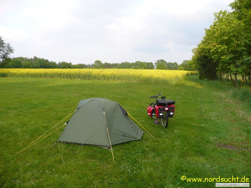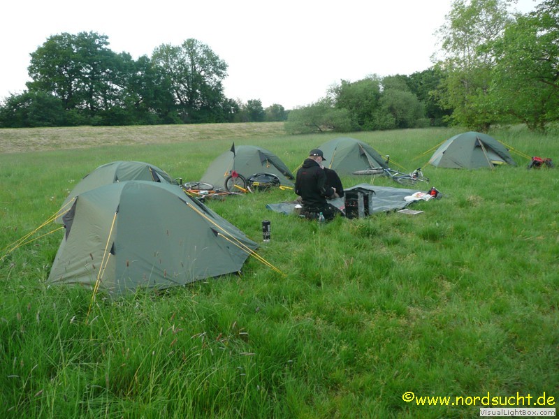Sonst war das Zelt trotz bösem, bösem Regen stets dicht. Positiv zu erwähnen ist noch das das Innenzelt irgendwie so beschichtet ist das Regentropfen wie beim Lotusblüteneffekt einfach abrollen. Hat sich Außen und Innenzelt (Dank nassem Abbau und Transport über den Tag) „voll gesaugt“ braucht es bei Sonnenbestrahlung 5-10, bei trüben Wetter max. 30Minuten bis es wieder völlig trocken ist.