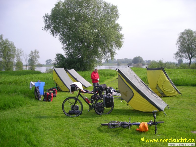 Die ganze Nacht saßen wir im Zelt mit fertig gepacktem Rucksack, und erwarteten jeden Moment das Zeltgestänge bricht. Beide Zelte haben diesen Sturm sowie den Regen fast schadlos überstanden. Lediglich die Firststange hat nun auf ihrer Länge von ca. 1,40m einen leichten Bogen mit ca. 1cm „Versatz“. Als wir wieder zu Hause waren, haben wir bei Wetter.com nachträglich die Wetterberichte durchgeschaut. In der besagten Nacht gab es in unserem Bereich Windböen von 149km/h und Windstärken von 9-10.