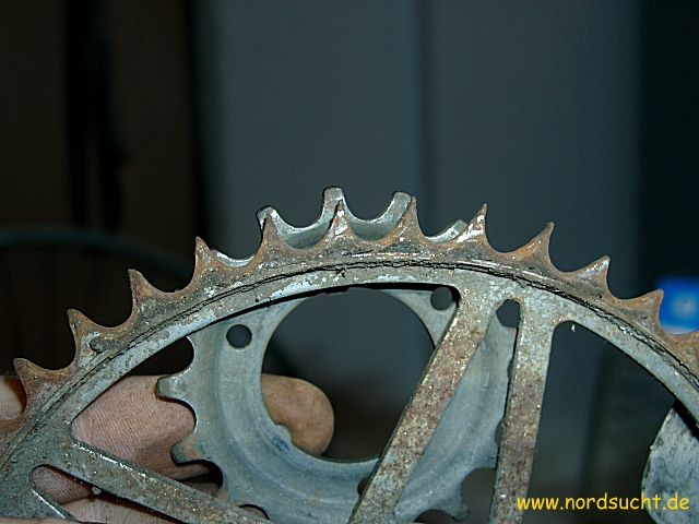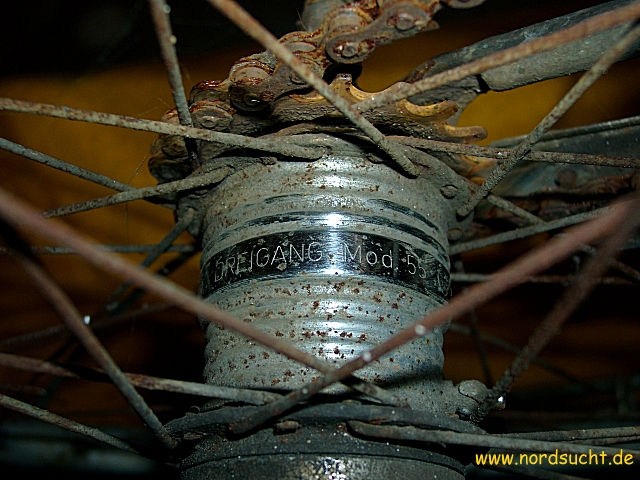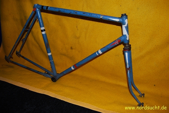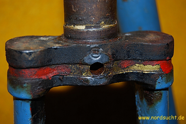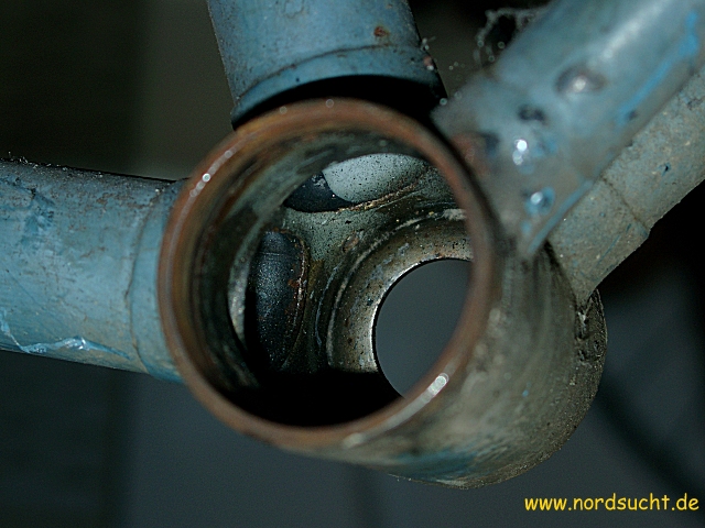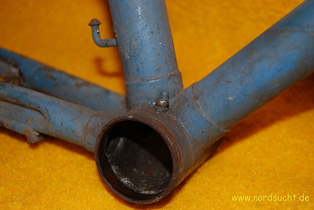 das Radl stand Jahrzehnte im Keller herum, der Reifen war so porös, das ich ihn wie Zwieback zerbröseln konnte. Als es schließlich eines Tages auf der Strasse im Sperrmüll lag, wanderte es in meine Sammlung. Steuersatz und Tretlager sind fest, die Torpedo 55 (Datierung 1958) lässt sich noch leichtgängig drehen. Ansonsten besitzt es eine Weinmann Seitenzugbremse sowie das fertigste Kettenblatt welches ich je gesehen habe. Leider wurde der der wunderschöne schwarz/weis/goldene Originallack lieblos mit Blau überstrichen. Nach der Zerlegung kam ein innen völlig rostfreier, fein mit Fett imprägnierter Rahmen zum Vorschein.