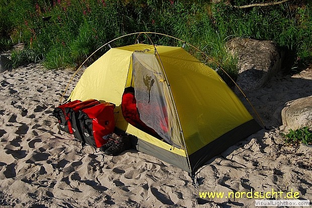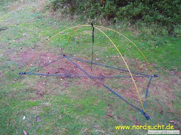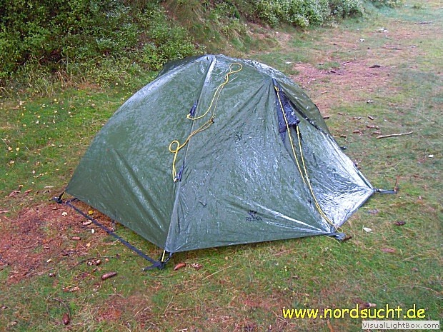 An meinem treuen Agadir Zelt störte mich schon immer, das eine Nutzung ohne Innenzelt nicht möglich war. Bei Winter- und Bergtouren könnte ich getrost auf mein Innenzelt verzichten. Also besorgte ich mir 4 passende Gestängefüße sowie ein paar Meter Verstärkungsband und zerschnitt 4 kleine Meru Spanngurte. Das alles habe ich in den Abmaßen des Innenzelt vernäht. Zum Fixieren der Gestängebögen und der Firststange habe ich erstmal einen Spanngurt verwendet. Später werde ich dort einen Gestängkreuzclip von MSR verwenden. Der ganze Innenzeltersatz wiegt nun anschließend 98g. Eine weiter Möglichkeit bestünde darin die Abspannpunkte gleich an eine passende Zeltunterlage zu vernähen, allerdings besteht dann immer mal wieder die Gefahr das Regenwasser perfekt über die Zeltaußenwand abläuft und in großen Mengen den Weg ins Innere des Zeltes findet.